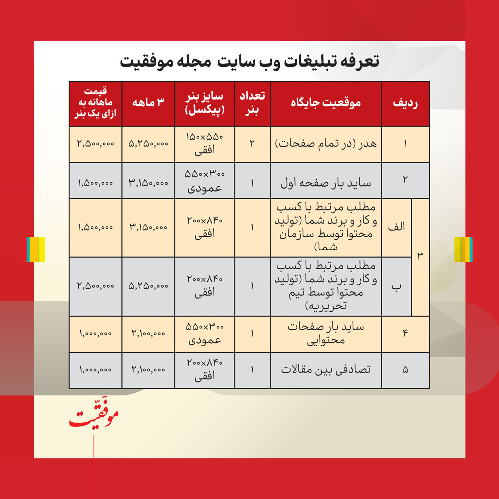 درج تبلیغات در کلیه بسترهای مجازی موفقیت با بیش ۵۰۰ هزار مخاطب + انتشار کامل گفت و گو و گزارش مصاحبه در وبسایت موفقیت و سایر بسترهای مجازی